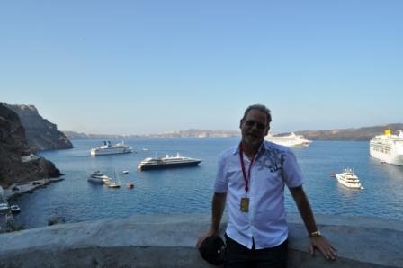 Santorini is as pretty as a postcard. We arrived early morning and we could see lots of white washed, blue topped houses on top of a volcano. The ship anchored in the bay, we used tender boats to ferry us to shore. Now we had 3 options of getting up to the town of Fira....by cable car, by donkey or by foot. The queue for the first 2 was very very long so we thought what the heck, lets walk. We used the same path as the donkeys... lots of poo, old and fresh and donkeys everywhere. It was a steep. 35 minute walk but the view was stunning. I gave up trying to avoid the poo, just trying to breathe was important I figured. We came across Gail and John, much like us in fitness!! We stopped often. We arrived at the top and found lots of small shops and stalls all selling the same things basically. Very narrow, cobbled stone streets and lots of people. The population of Fira is 14,000 and today there was 7 cruise ships in and 15,000 people descended on the town! We came across quad bikes for hire and as the town of Fira and Oia are very far apart, we hired one. Yes family we did. 20 euros for the day and 10 euros for fuel and off we went. I had to keep reminding George to drive on the right side, a bit alarming when cars are coming toward you lol. We had a great time, drove from one side to the other and back, the steep cliffs are a bit scary and I felt like Casey Stoner as I leaned to one side going round the corners. George often shouted "lean left", or "lean right" so he could keep up the speed on the 50cc quad. The views were outstanding. After 3 hours on the quad, we handed it back, feeling a bit like John Wayne.. Did some browsing around the shops then caught the cable car down to the port. One absolute fantastic day and a place we have to visit again. We had originally booked a tour here but luckily we cancelled it, it was easy to do on your own and a hell of a lot more fun.